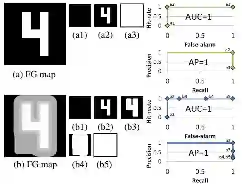然而,该方法已经被证明[1] 存在天然的缺陷。例如图1中(a)和(b)是两个完全不同的前景图,但是经过阈值化计算AP和AUC后,最后的评价结果是AP=1, AUC=1。这表示两个前景图的检测效果相当,这显然不合理。