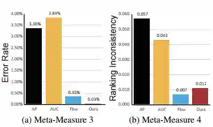 为了证明指标的有效性和可靠性,研究人员采用元度量的方法来进行实验。通过提出一系列合理的假设,然后验证指标符合这些假设的程度就可以得到指标的性能。简而言之,元度量就是一种评测指标的指标。实验采用了5个元度量: