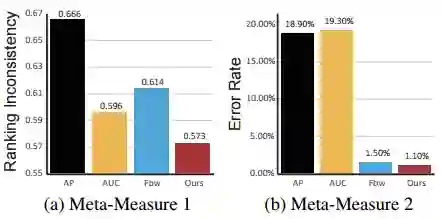 实验结果表明:我们的指标分别在PASCAL, ECSSD, SOD和HKU-IS数据集上比排名第二的指标错误率降低了67.62%,44.05%,17.81%,69.23%。这清楚地表明新的指标具有更强的鲁棒性和稳定性。