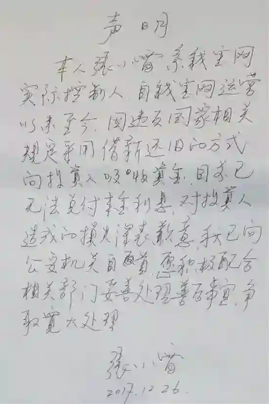 2017年12月27日,南京市公安局官方微博“平安南京”发布消息称,钱宝网实际控制人张小雷因涉嫌非法集资犯罪,于2017年12月26日向南京市公安机关投案自首。他的自首书上清楚写着:“因违反国家相关规定,采取借新还旧的方式向投资人吸收资金,目前已无法兑付本金利息。”