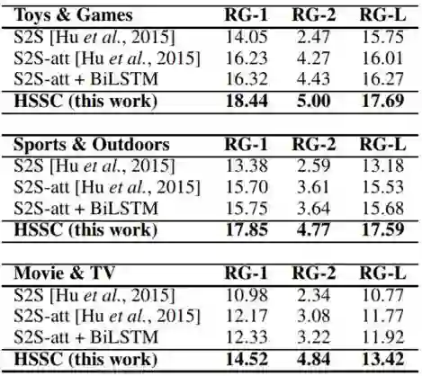 表 1:我们的模型和抽象式摘要的序列到序列基准在 Amazon SNAP 测试集上的比较。这个测试集包含三大领域:玩具&游戏、运动&户外、电影&电视。RG-1、RG-2、RG-L 分别表示 ROUGE-1、ROUGE-2、ROUGE-L。