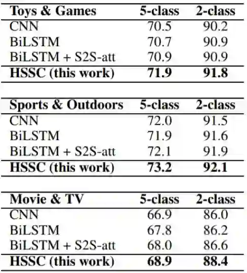 表 2:我们的模型和情感分类的序列到序列基准在 Amazon SNAP 测试集上的比较。这个测试集包含三大领域:玩具&游戏、运动&户外、电影&电视。5-class 和 2-class 分别表示五类情感和二类情感分类的准确度。