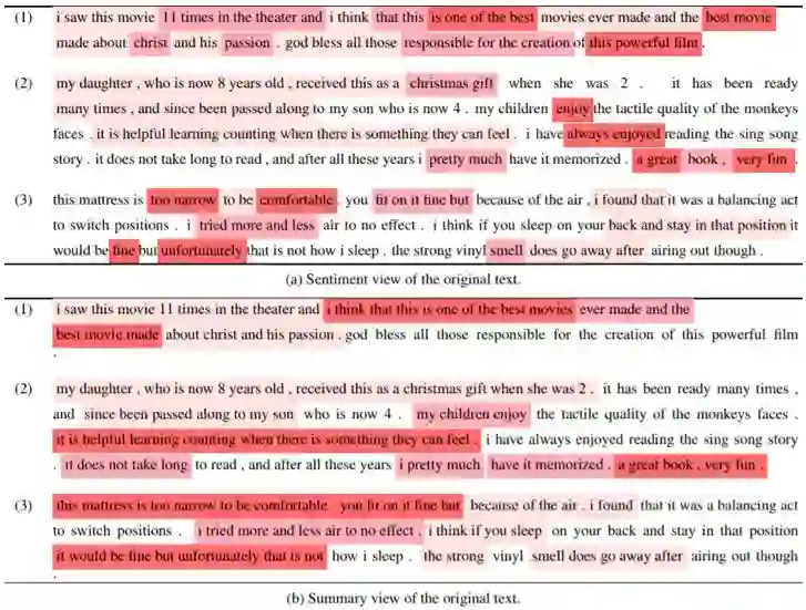 我们在亚马逊在线评论数据集上评估了我们提出的模型。实验结果表明我们的模型在抽象式摘要和情感分类上都能实现比强大的基准系统更优的表现。