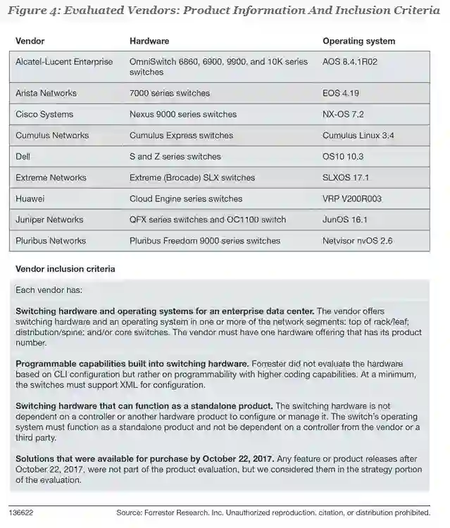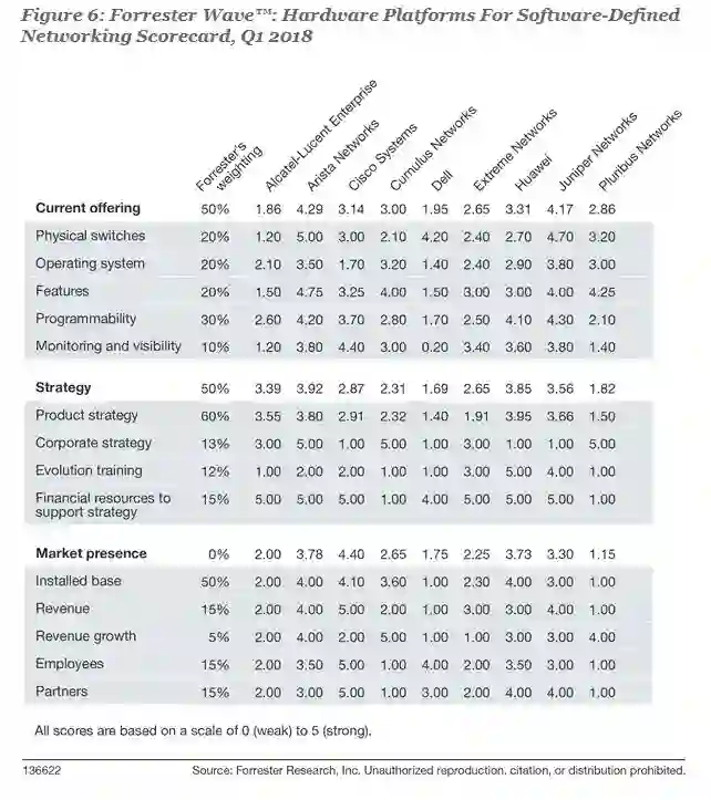 Forrester评估了九家供应商:阿尔卡特朗讯、Arista Networks、极进网络、思科、Cumulus Networks、戴尔、华为、瞻博网络和Pluribus Networks。这每一家供应商都有这些(见下图):