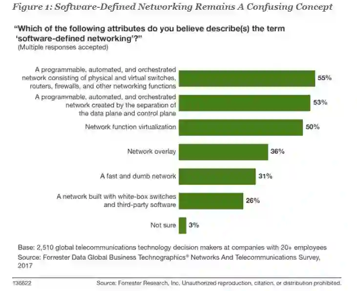 一系列令人困惑的术语和定义。为了构建下一代网络,I&O团队需要明确的网络策略,并深入了解技术。只有55%的电信技术决策者告诉我们,他们认为SDN包含一个可编程、自动化、经过编排的网络,这个网络由物理和虚拟交换机、路由器、防火墙及其他网络功能组成(见图1)。 36%的决策者认为,SDN是完全独立于硬件层的网络覆盖技术(overlay)。