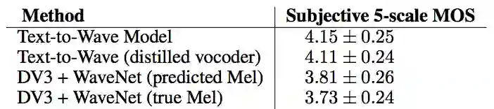 该分数表明text-to-wave模型明显比其他模型表现得好,并且有经过蒸馏的语音编码器的模型呢自回归神经编码器的表现水平相当。