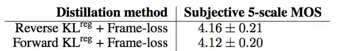 接着我们将一个60层的并行学生网络从20层的高斯自回归WaveNet中进行蒸馏,它包括6个堆叠的高斯逆自回归流,每个流都由一个10层的WaveNet进行参数化。我们测试了前向和逆向KL散度,结果如下:
