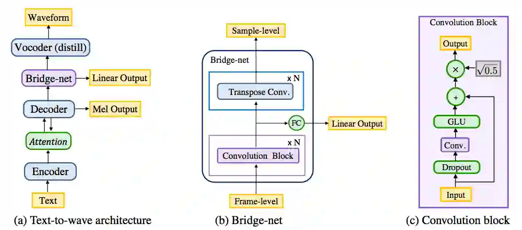 Bridge-net:这是一个卷积中间处理模块,它可以从解码器中处理隐藏表示,并且预测log-linear声谱。与解码器不同的是,它并非是因果联系的,并且可以使用未来的语境。另外,它还可以从框架层到采样层对隐藏表示进行上采样。