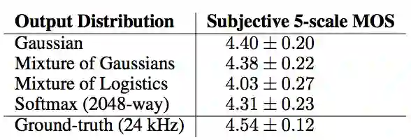 结果表示,高斯自回归WaveNet和MoGul以及softmax输出水平相当,比MoL要好。