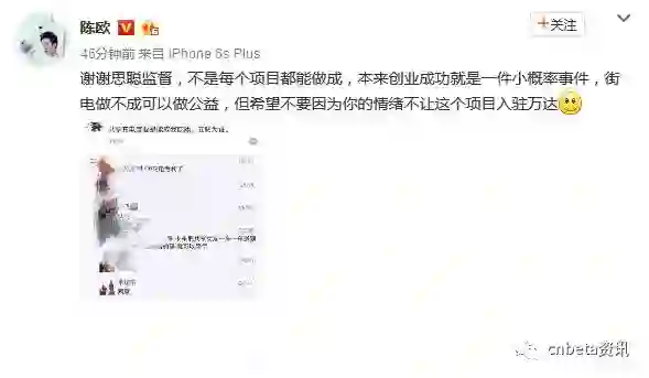 “谢谢思聪监督,不是每个项目都能做成,本来创业成功就是一件小概率事件,街电做不成可以做公益,但希望不要因为你的情绪不让这个项目入驻万达”。