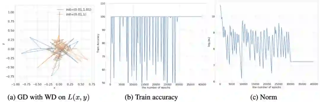 注意,WD 在这种影响中起着关键作用,因为没有 WD,参数范数单调增加,这意味着 SGD 始终远离原点。