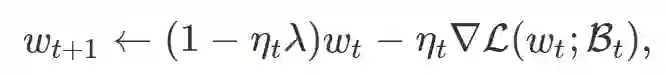 λ表示权重衰减 (WD) 因子(或者ℓ2 - 正则化系数),ηt 表示学习率,Bt 表示 batch,∇L(wt,Bt)表示 batch 梯度。