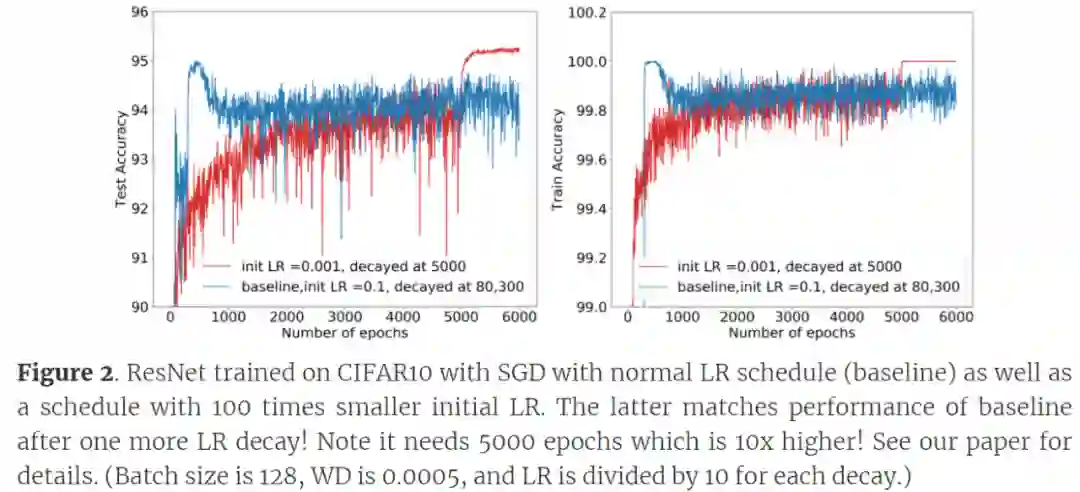 令人惊讶的是,即使没有其他超参数变化,泛化能力也不会受到太小 LR 的影响。论文《An Exponential Learning Rate Schedule for Deep Learning》中,研究者通过其他超参数的变化来补偿小 LR。