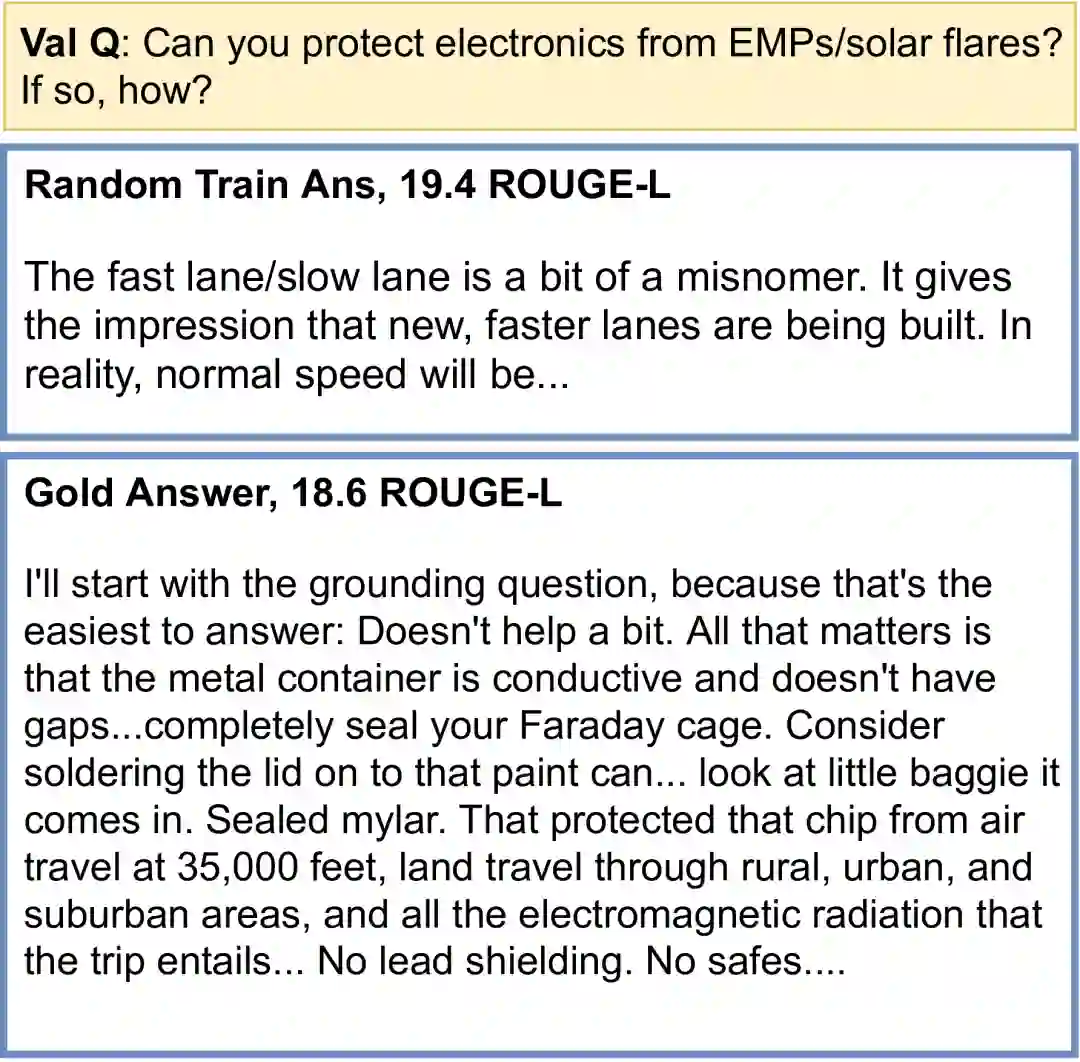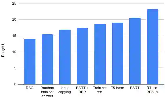 不过,虽然这个系统在公开排行榜上名列前茅,但我们发现 ELI5 数据集及其相关评估指标的一些趋势令人担忧。特别要强调的是,我们发现 1) 几乎没有证据表明模型实际使用了它们所要求的检索;2) 平凡基线(例如输入复制)击败了现代系统,如 RAG/BART+DPR;以及 3) 数据集中存在大量训练/验证重叠。我们的论文针对每一个问题提出了缓解策略。
