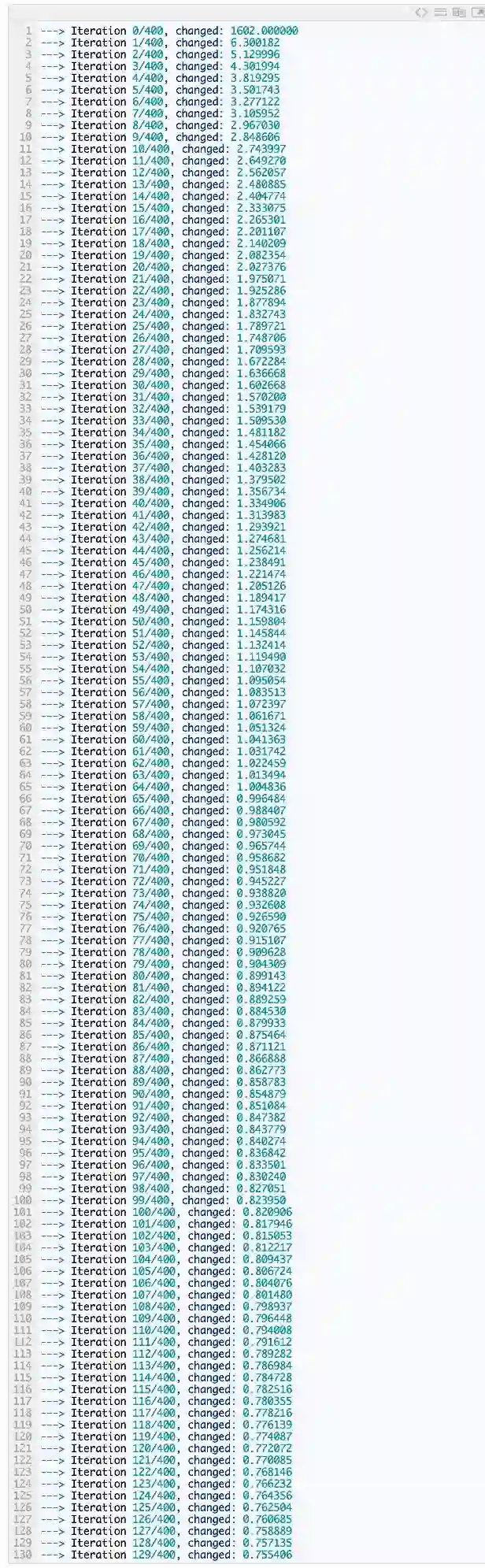 print "---> Iteration %d/%d, changed: %f" % (iter, max_iter, changed)