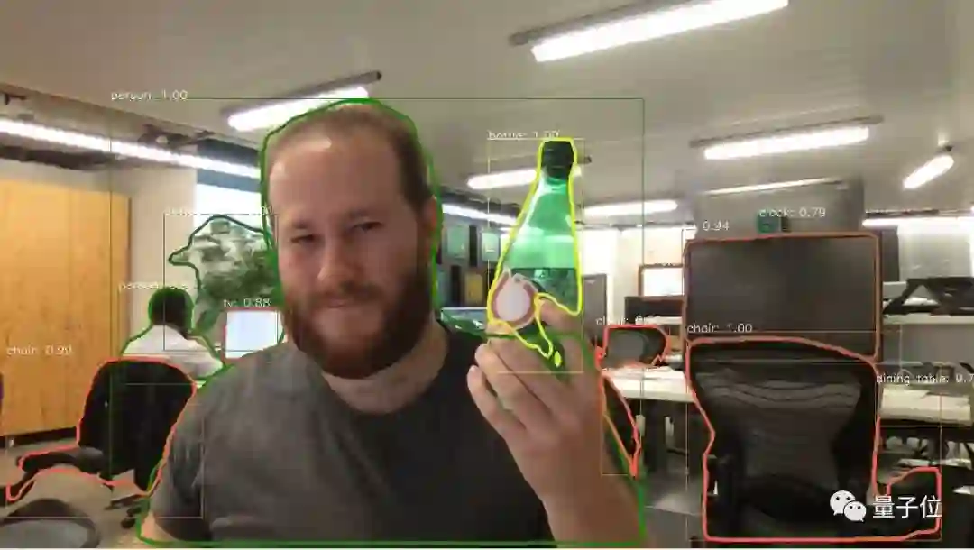 负责这一项目的Facebook AI工程师Francisco Massa还在个人Twitter发了张自拍照,并使用新工具对图片中的物品进行了识别,尴尬的是好像有些对象被识别错误: