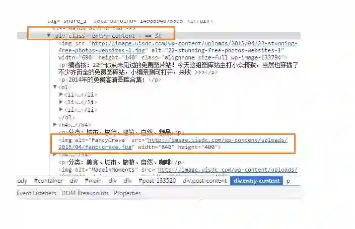 而我们是需要下载全部的图片,所以还需要查看整体的网页结果,也就是说找出img所在的分区结构,我的查找方法就是不断的往上找,例如顺着前面的三角符号往上查找它的上一级,就是img所在的分区结构“div”,如图所示: