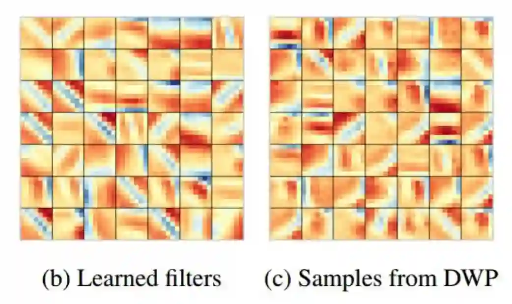 具体地讲,本文在 cifar10 数据集上用两层的 5 * 5 和 7 * 7 卷积核作为网络结构,分别训练了 CNN,从中获取了这两类网络架构的权重值作为数据进行学习。学习得到权重的implicit distribution 之后,作为具有同样结构的Bayesian CNN 的权重的 prior 来应用。