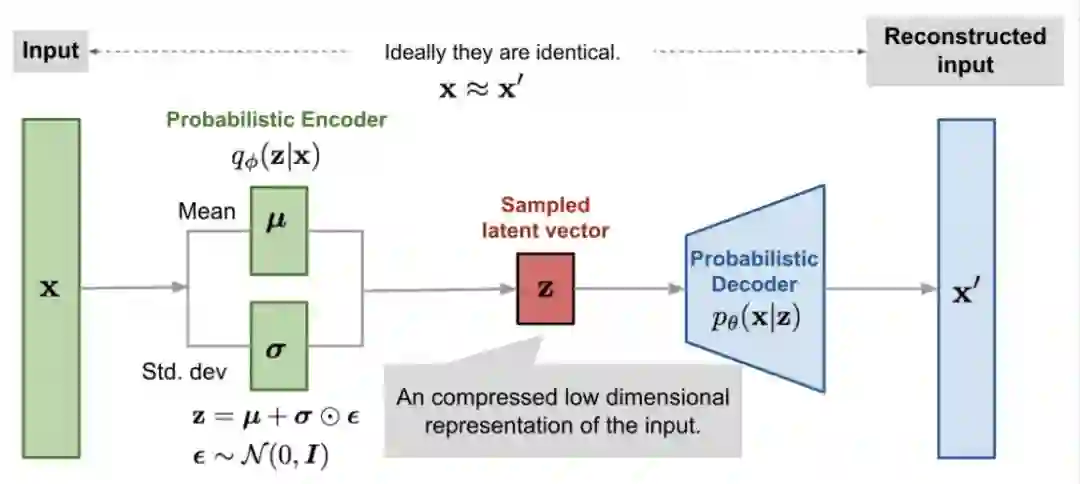 深度生成模型中两个最有名的模型是 GAN 和 VAE,有工作介绍过GAN 和 VAE 从 VI 的视角是可以统一起来的。这类简单介绍一下VAE,VAE 是一种隐变量模型(Latent Variable Model, LVM)和深度学习巧妙结合的产物。如下图: