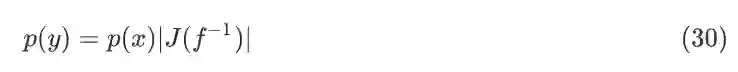 其中,p(y) 是 y 的分布,p(x) 是 x 的分布,这里 y=f(x),J 是指雅可比矩阵,即多元函数一阶导数矩阵。