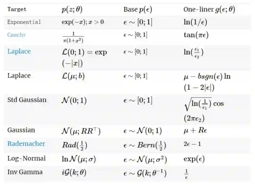 如上述公式,从一个含参 θ 分布中采样,等同于从一个简单无参分布中采样,然后进行函数变换,并且此函数的参数也是 θ。变换前,采样是直接从所给分布中进行,而采用重参数化技巧后,采样是间接地从一个简单分布进行,然后再映射回去,这个映射是一个确定性的映射。其中,映射有很多中思路,比如:逆函数、极变换等方法。