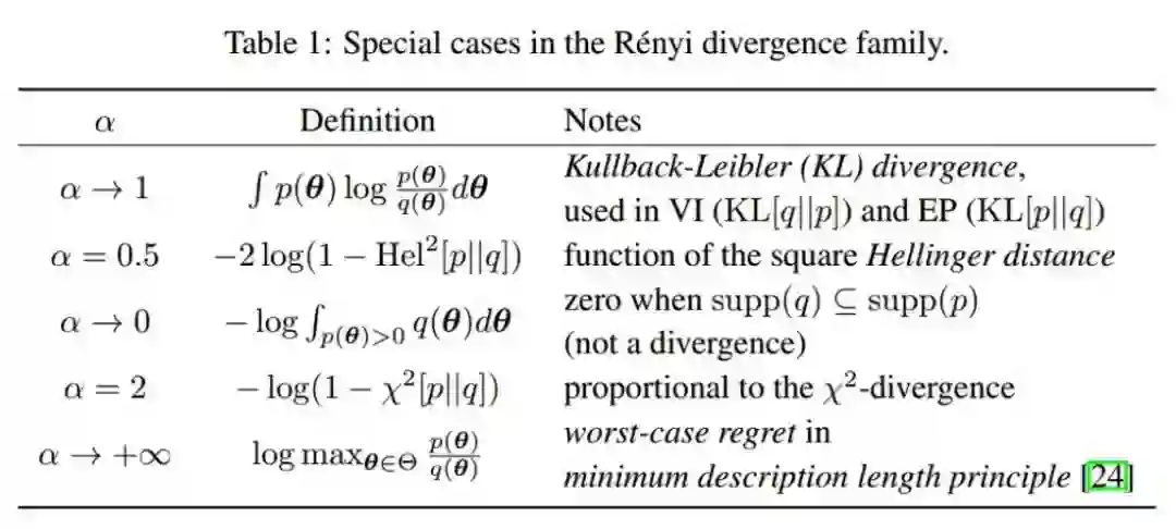 除了 Renyi 的定义,还有很多不同的定义,有的定义会恰好可以统一VI 和 EP 两种方法,如下图所示,当 α=0 时,该 Divergence 等价于 KL(q||p),相当于是 VI 方法;当 α=1 时,该 Divergence 等价于 KL(p||q),相当于是 EP 方法。