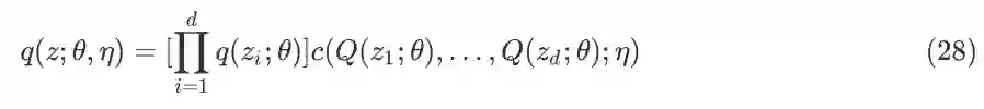 将公式(28)代入到公式(8)得到 Copula VI 的 EBLO,剩下的工作就是推导 ELBO 的梯度估计式,利用随机优化算法更新参数,不同于一般的 VI,Copula VI 有两种参数,一种是描述变分分布的参数,另一种是描述 Copula 的参数,在训练时,固定其中一种来训练另外一种。梯度估计的公式推导在下一小节会有详细介绍,这里不再赘述。