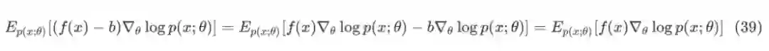 这样会带来非常多的便利,比如:一种降低估计方差的思路,将代价函数 f(x) 改造为 f(x)-b ,其中 b 是所谓的 baseline。因为 score function 的期望为 0,所以: