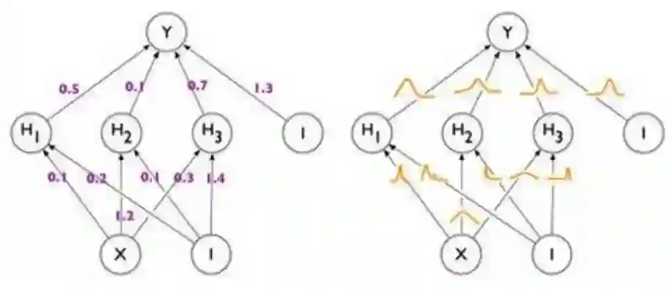 贝叶斯神经网络不同于一般的神经网络,其权重参数是随机变量,而非确定的值。如下图所示: