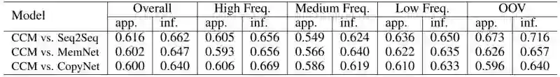 从图5中可见,CCM对于三个基线系统来说,都有将近60%的回复是更优的。并且,在OOV的数据集上,CCM比seq2seq高出很多,这是由于CCM对于这些低频词或未登录词,可以用知识图谱去补全,而seq2seq没有这样的知识来源。