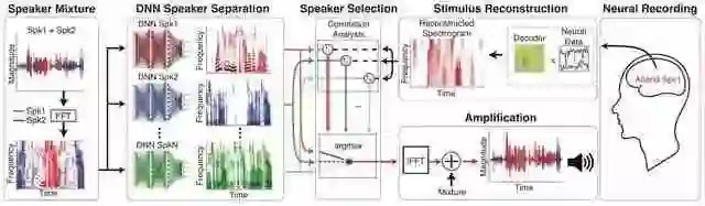 最终,Mesgarani的团队开发了一个端对端系统,这个系统会根据使用者神经信号的解码信号选定到特定的音频接收通道,其中每个通道都包含一个全频扬声器。随后该系统会自动分离全频扬声器中的声音信号,确定使用者关注的声音信号,然后放大该信号,确保使用者能够清晰听见。