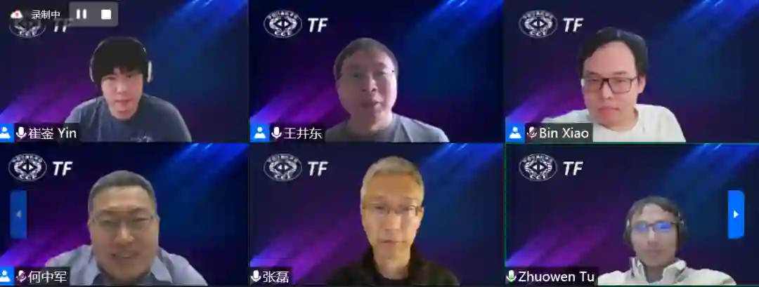 在Panel环节,三位报告人与来自UCSD的屠卓文教授(IEEE Fellow)、IDEA的张磊教授(IEEE Fellow)就视觉基础模型的发展与挑战、落地应用、未来发展等展开了热烈讨论。屠卓文认为视觉基础模型虽然取得了一定进展,但是与自然语言处理(NLP)大模型取得的效果相比,还未取得令人惊叹的进步。可能的原因是视觉是统计信号,而语言则经过人类加工抽象融合了更多知识。肖斌则认为视觉基础模型从训练数据、参数量来看,比NLP预训练模型要小。崔崟认为语言是高层次语义的抽象,而视觉数据相对来说冗余比较大,相应的计算量也大。随着预训练模型规模越来越大,也引发了人们对大模型还是小模型方面的讨论。张磊认为,大模型可以学习和吸收大数据包含的模式,而小的网络(模型)则未必能够“消化”庞大的数据。各位嘉宾还对落地应用、跨模态预训练模型等与参会人员展开了互动和讨论。