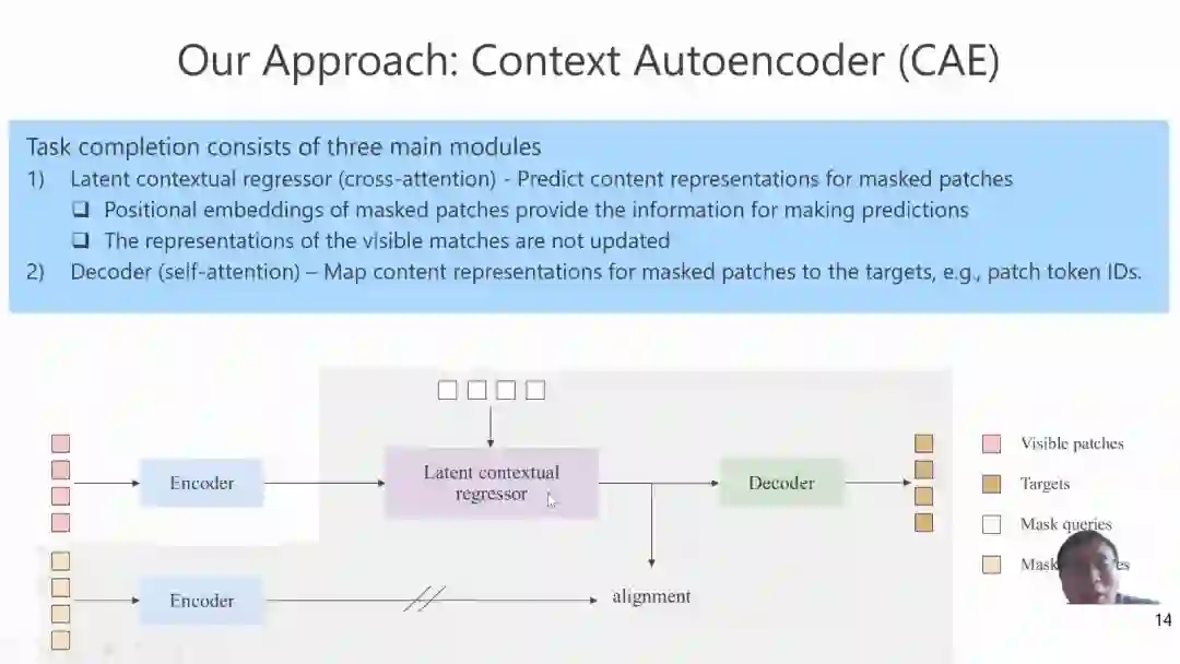 百度计算机视觉的首席科学家王井东博士介绍了在自监督预训练方面的进展。在本次分享中,介绍了一种新颖的掩码图像建模方法,即Context Autoencoder (CAE),用于规模化的自监督表征学习预训练。核心思想包括在隐表示空间中进行从可见块到掩码块的预测,编码器仅用于表示学习,表示学习仅由编码器进行。实验表明,在物体检测和实例分割等任务上,CAE相比于对比预训练(例如 SimCLR、MoCo)等模型,取得了显著提升。