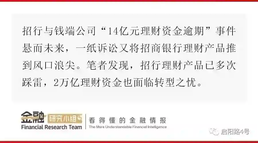 招商银行理财产品陷入多事之秋,此前招行与钱端公司“14亿元理财资金逾期”事件悬而未来,一纸诉讼又将招商银行理财产品推到风口浪尖。