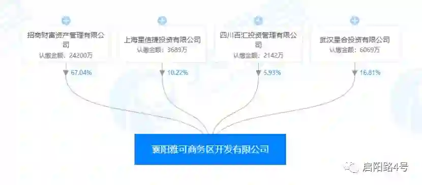 襄阳雅可成立于2004年,注册资本3.6亿元,参保人数为23人,注册地为湖北襄阳,主要经营房地产开发、商品房销售等。成立之初的出资方为上海星信捷投资有限公司、四川百汇投资管理有限公司和武汉星合实业投资有限公司。2014年9月,工商注册信息显示,襄阳雅可新增投资人招商财富,出资2.42亿元,成为第一大股东,持股比例为67.04%。