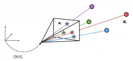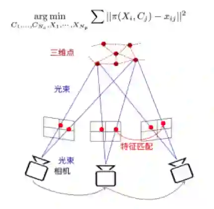首先我们了解下SfM的技术框架,一共四个主要步骤:①数据采集;②特征提取;③数据关联;④结构恢复。在恢复场景的三维结构时,并不是使用图像中的所有像素点,而仅从图像中提取稳定、显著的点,也就是特征点;数据关联是确定有共视区域的两张图像中哪些特征点是对应的;后续会借助几何的方法以及最优化技术(Bundle Adjustment)将这些图像中的点恢复为空间的三维点。整个问题最终被转化为大型非线性最优化问题求解,优化目标是重建的三维点重投影到图像中的位置与图像中的观测点位置差最小,也就是最小化重投影误差。