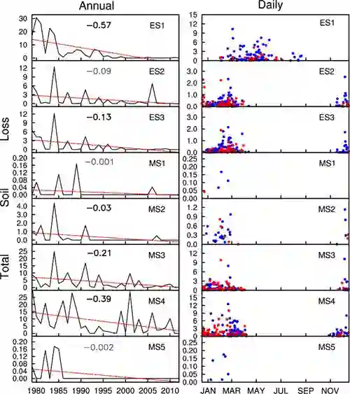 青藏高原铁路沿线8个站点在1979至2012年间土壤损失年累积量及其变化趋势及日累积量(kg/m2)