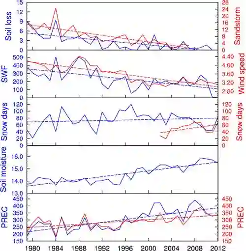 耦合模式模拟的土壤损失量、积雪日数、土壤湿度及来自驱动数据的年累积降水(PREC)、大风次数(SWF)年变化趋势(蓝线)与观测的沙尘暴发生次数、平均风速、积雪天数和降水的变化趋势(红线)