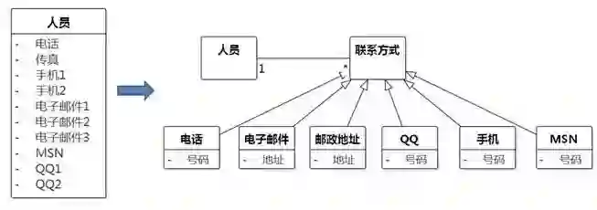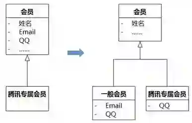 在日常应用中也有类似于矩形和正方形的情况。例如,会员的Email和QQ可以自由变化,但有一种会员,我们姑且称为“腾讯专属会员”,他的Email只能用他QQ号下的QQ邮箱,Email和QQ两个属性之间有依赖,那么图8-87左侧关系是不合适的,应该改为右侧的关系。