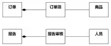 也就是说,部分对象只应该作为整体对象的一部分存在,不应独立存在,所以部分类的命名往往有整体类的味道,如图8-93所示,“订单”和“订单项”之间的关联是组合,但接下来的“订单项”和“商品”之间的关联不是组合;同样,“报告”和“报告审核”之间的关联是组合,但接下来的“报告审核”和“人员”之间的关联不是组合。
