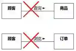 “8.1.6.4 切勿照猫画虎”里提到的“类图长得像用例图”的图8-52,有可能也错把系统不需要维护的关系当成了关联。系统很可能不需要记住哪个顾客查询过哪件商品,类似的情况还有,系统很可能不需要记住哪个顾客查询过哪张订单。如图8-95所示。
