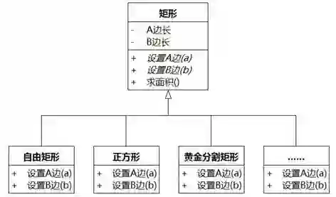 或者如图8-86,把超类“矩形”到底保留几个边长属性以及如何求面积的实现下放到子类。这样的处理相当于把邻边互有依赖的领域知识放在属性中,而不是放在操作中。