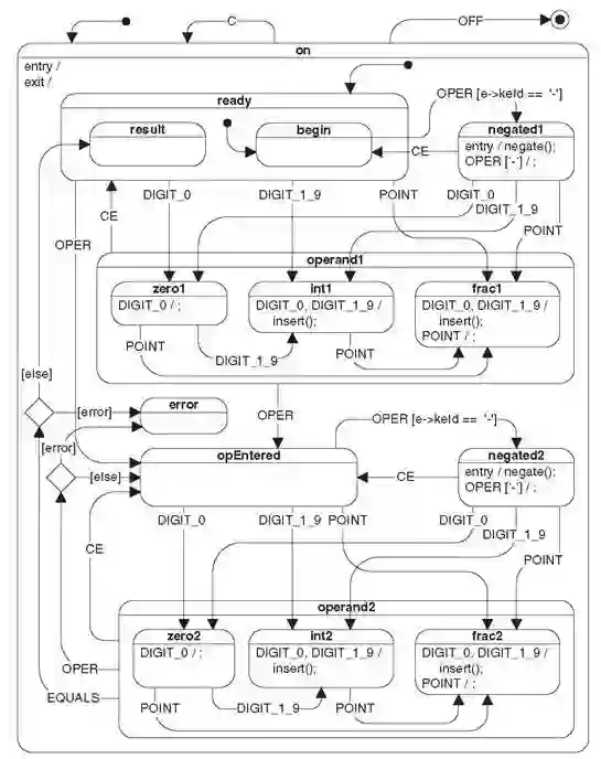 图8-15是Miro Samek在他的书[Samek 2008]中举的计算器例子。小小计算器要做到没有漏洞,其中的思考也很复杂。如果不先用层次状态机的图形对领域逻辑显式建模,再根据模型通过工具或人工映射到实现,而是直接下手实现,领域逻辑靠临时脑补,得到的代码必定破绽百出。[5]