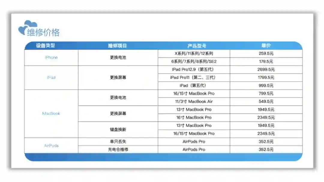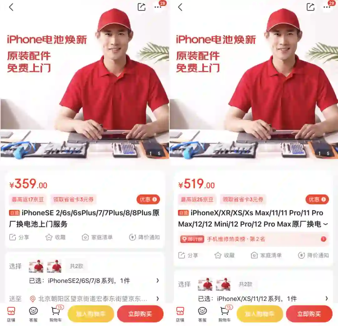 iPhone 原厂电池五折更换按照型号主要分为两大类,一类是针对 iPhoneX 系列、iPhone 11 系列和 iPhone 12 系列原厂电池更换服务,原价为 519 元,5 折后 259.5 元;另外一类则是第二代 iPhoneSE、iPhone6、7、8 系列的,价格相对便宜,为 179.5 元。