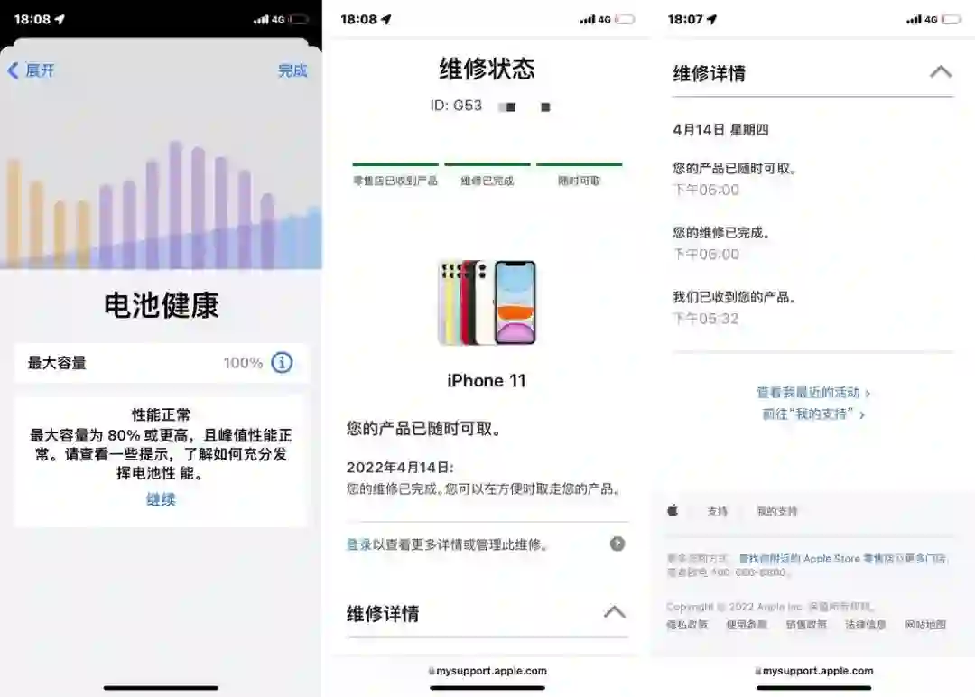 等待一段时间完成认证后,可以正常的显示电池的健康度信息,同时到 Apple 官网可以查询到正常的维修信息: