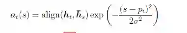 Local Attention首先会为decoder端当前的词,预测一个source端对齐位置(aligned position)pt,然后基于pt选择一个窗口,用于计算背景向量ct。Position pt的计算公式如下: