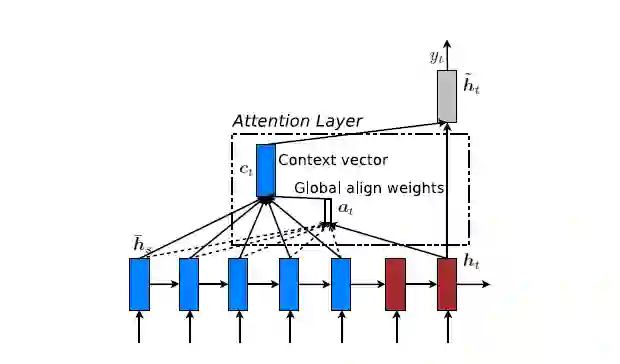 在t时刻,首先基于decoder的隐状态ht和源端的隐状态hs,计算一个变长的隐对齐权值向量at,其计算公式如下: