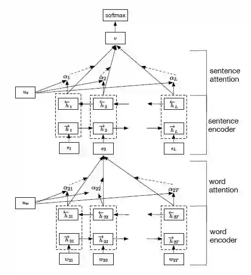 Zichao Yang等人在论文《Hierarchical Attention Networks for Document Classification》提出了Hierarchical Attention用于文档分类。Hierarchical Attention构建了两个层次的Attention Mechanism,第一个层次是对句子中每个词的attention,即word attention;第二个层次是针对文档中每个句子的attention,即sentence attention。网络结构如图10所示。