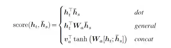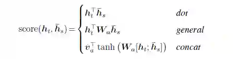 其中,Score(ht,hs) = aij表示源端与目标单单词对齐程度。可见,常见的对齐关系计算方式有,点乘(Dot product),权值网络映射(General)和concat映射几种方式。