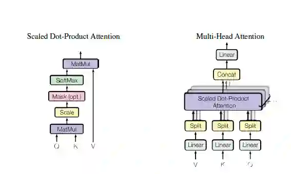Self Attention也是在Scaled Dot-Product Attention单元里面实现的,如上图左图所示,首先把输入Input经过线性变换分别得到Q、K、V,注意,Q、K、V都来自于Input,只不过是线性变换的矩阵的权值不同而已。然后把Q和K做dot Product相乘,得到输入Input词与词之间的依赖关系,然后经过尺度变换(scale)、掩码(mask)和softmax操作,得到最终的Self Attention矩阵。尺度变换是为了防止输入值过大导致训练不稳定,mask则是为了保证时间的先后关系。